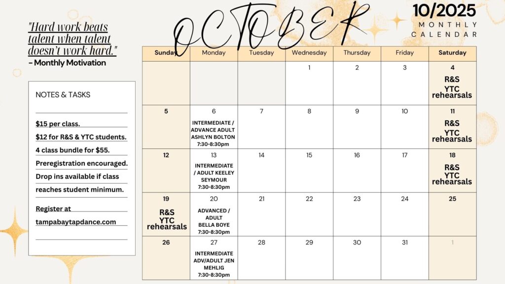 Autumn is here, and with it comes weekly Tampa Bay Taps open classes for intermediate to advanced dancers aged 11 and older! Stay tuned for future dates!